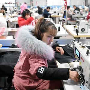 2月13日,在靜寧縣城關(guān)鎮南關(guān)村一制衣工廠(chǎng),工人在縫制衣服。