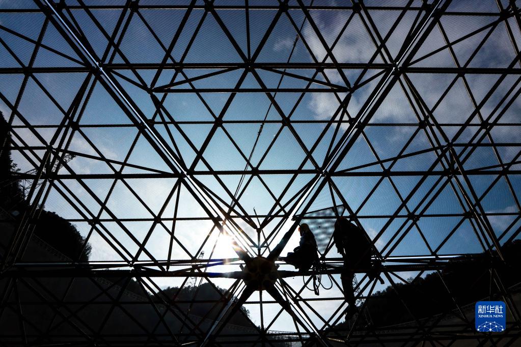 2月13日,工作人員對“中國天眼”的反射面板進(jìn)行維護保養(維護保養期間拍攝)。
