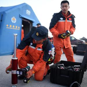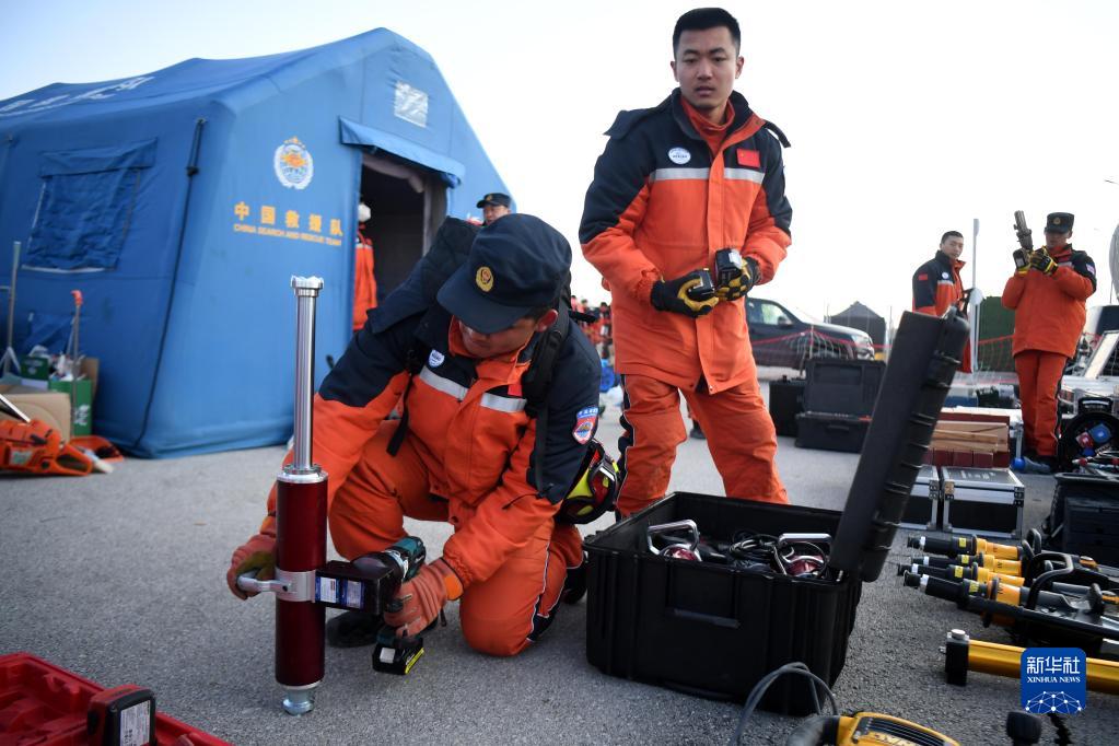 2月11日,在位于土耳其哈塔伊省哈塔伊體育館外的中國救援隊營(yíng)地,救援隊隊員檢查設備。
