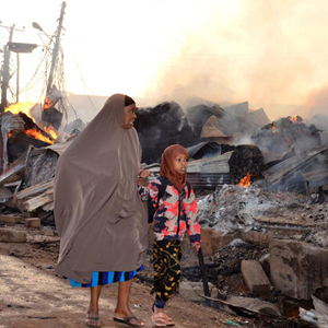 2月13日,在烏干達首都坎帕拉近郊的基塞尼,人們走過(guò)一處燃燒的廢墟。