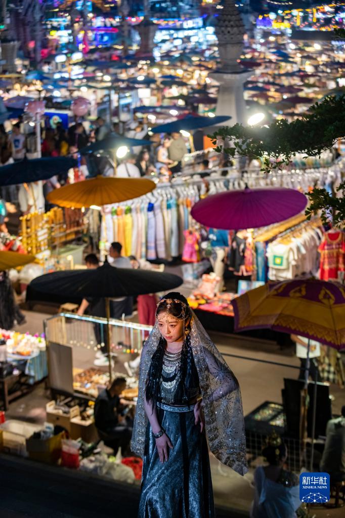 2月12日,一名游客在西雙版納州景洪市告莊西雙景星光夜市旅拍。