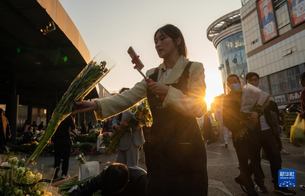 主播畢茜茜在斗南花卉交易市場(chǎng)為顧客介紹鮮切花(2月13日攝)。