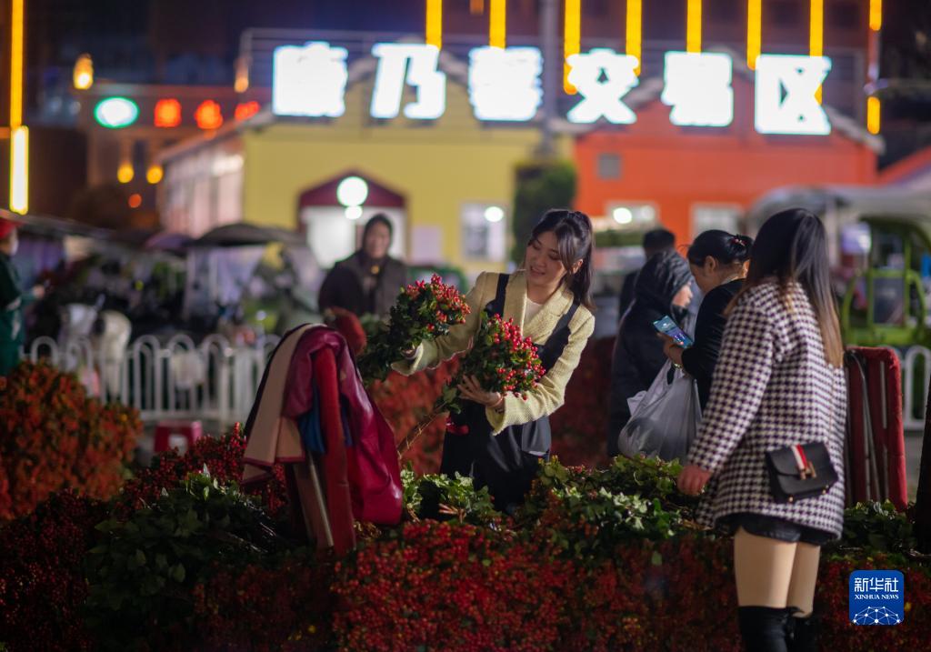 主播畢茜茜在斗南花卉交易市場(chǎng)挑選鮮花(2月13日攝)。