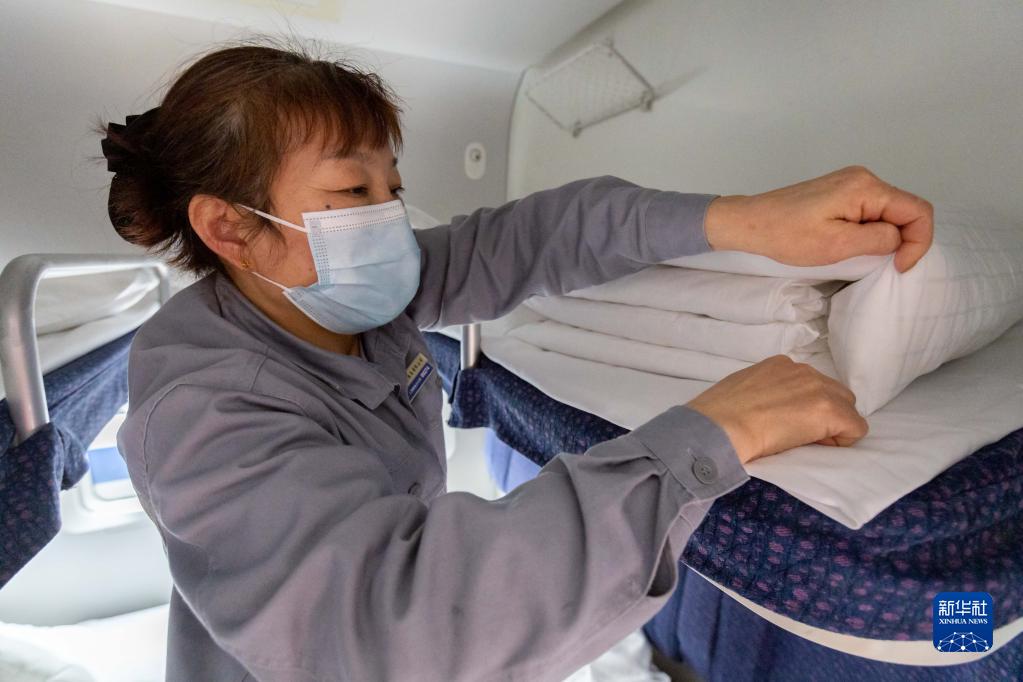 2月14日,工作人員將干凈的臥具整齊疊放在床位上。