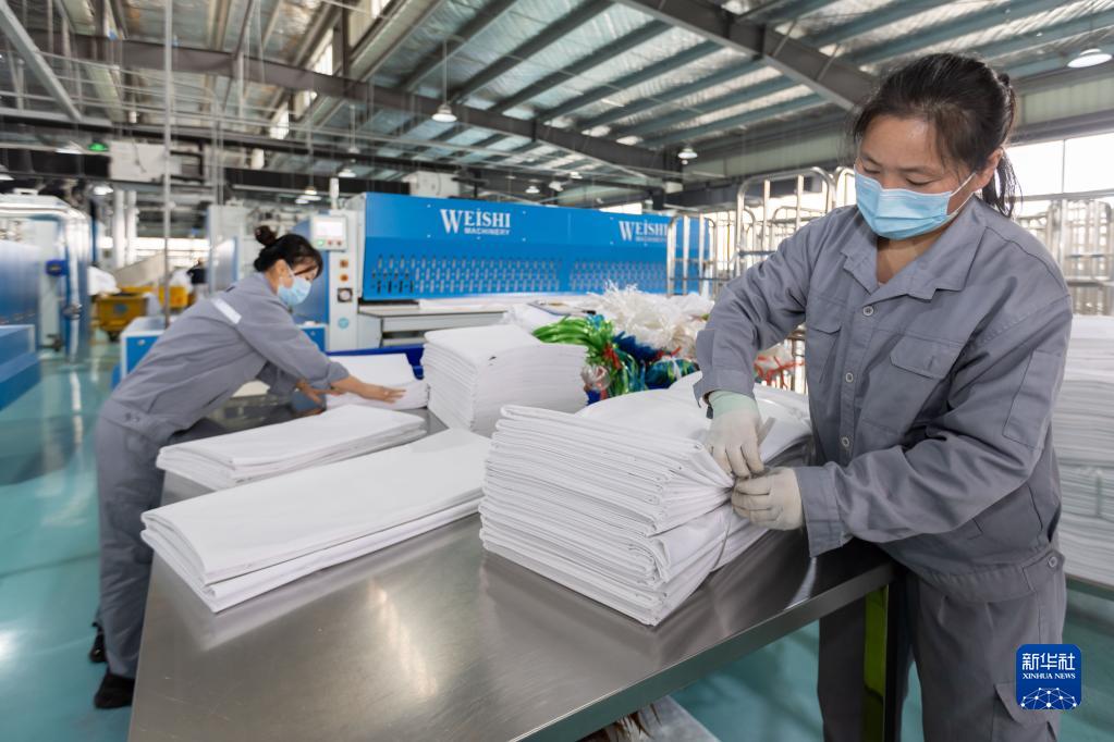 2月14日,工作人員將清洗好的被單打包。