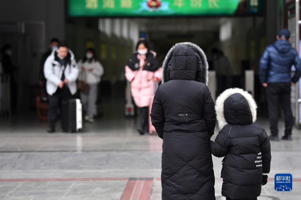 1月16日,在蘭州火車(chē)站西出站口,一名女士帶著(zhù)孩子翹首以盼丈夫出站。