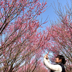 早春時(shí)節,位于安徽省巢湖市廟崗鎮清水灣梅花園的千畝梅花相繼盛開(kāi),朵朵梅花如霞似火,吸引人們徜徉花海,感受春日的美好。