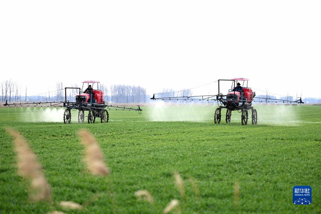 2月14日,在安徽省蚌埠市五河縣頭鋪鎮,農民駕駛農機給小麥噴灑農藥。