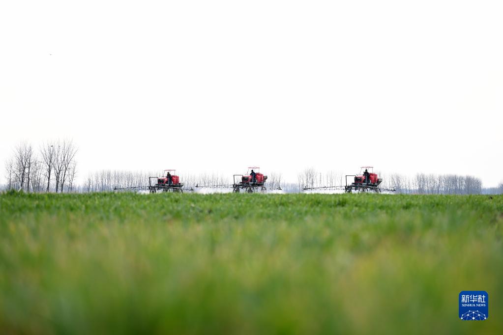 2月14日,在安徽省蚌埠市五河縣頭鋪鎮,農民駕駛農機給小麥噴灑農藥。