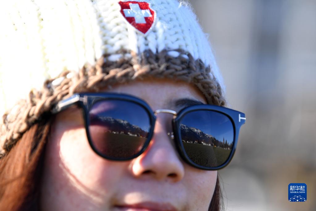 2月14日,一名中國游客在瑞士中部伯爾尼州因特拉肯地區欣賞雪山景色。