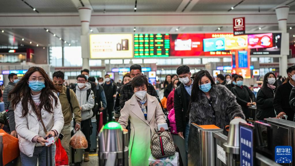 2月15日,旅客在貴陽(yáng)北站通過(guò)閘機準備乘車(chē)。