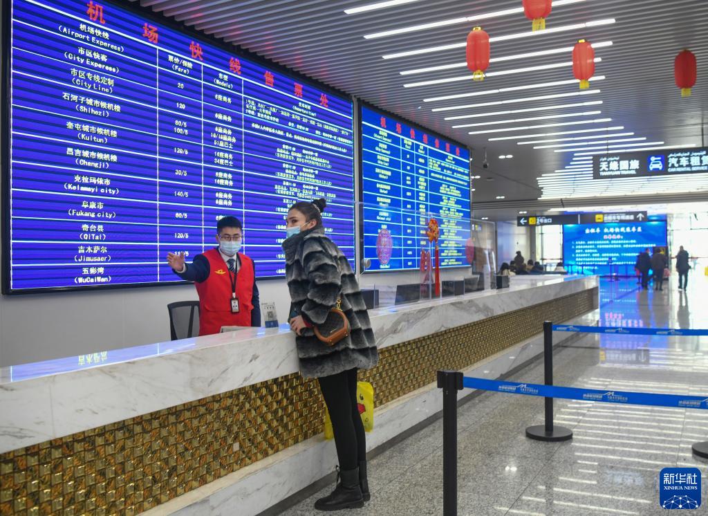 2月15日,在烏魯木齊地窩堡國際機場(chǎng)空港客運綜合樞紐站,旅客咨詢(xún)機場(chǎng)快線(xiàn)乘車(chē)事宜。