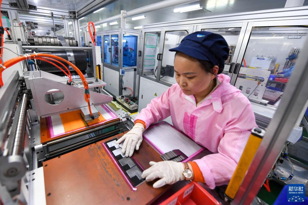在常州富烯科技股份有限公司生產(chǎn)車(chē)間,工人在生產(chǎn)線(xiàn)上生產(chǎn)加工石墨烯導熱膜(2月14日攝)。