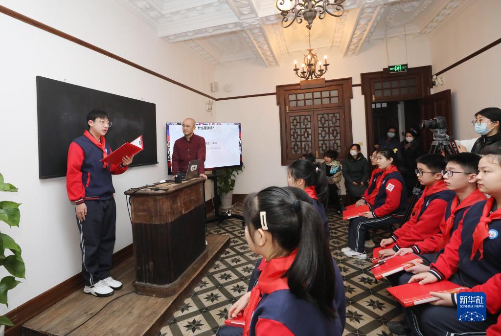 2月15日,在中國左翼作家聯(lián)盟成立大會(huì )會(huì )址紀念館課堂上,上海市演講與口語(yǔ)傳播研究會(huì )林毅老師(左二)指導一名同學(xué)演講時(shí)的口語(yǔ)表達技巧。