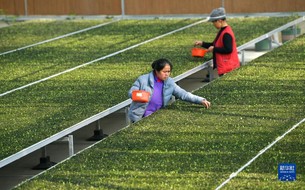 2月15日,工人在貴州省從江縣貫洞鎮淫羊藿育苗基地的溫室大棚里管護淫羊藿苗。