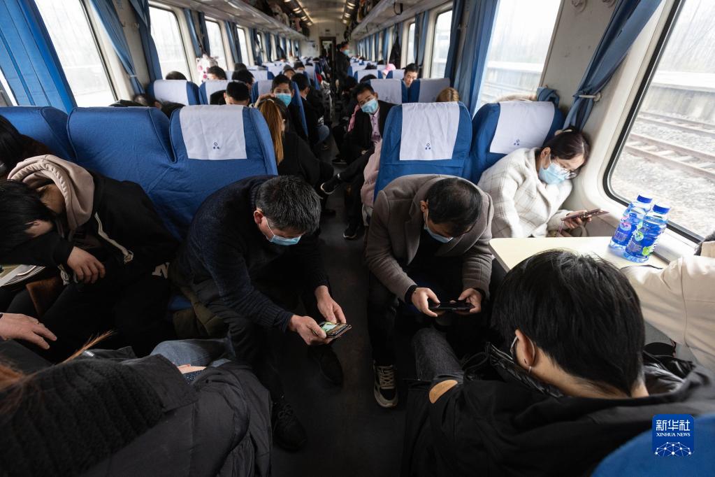 2月14日,在臨客K4618次列車(chē)上,幾名乘客在硬座車(chē)廂看手機。
