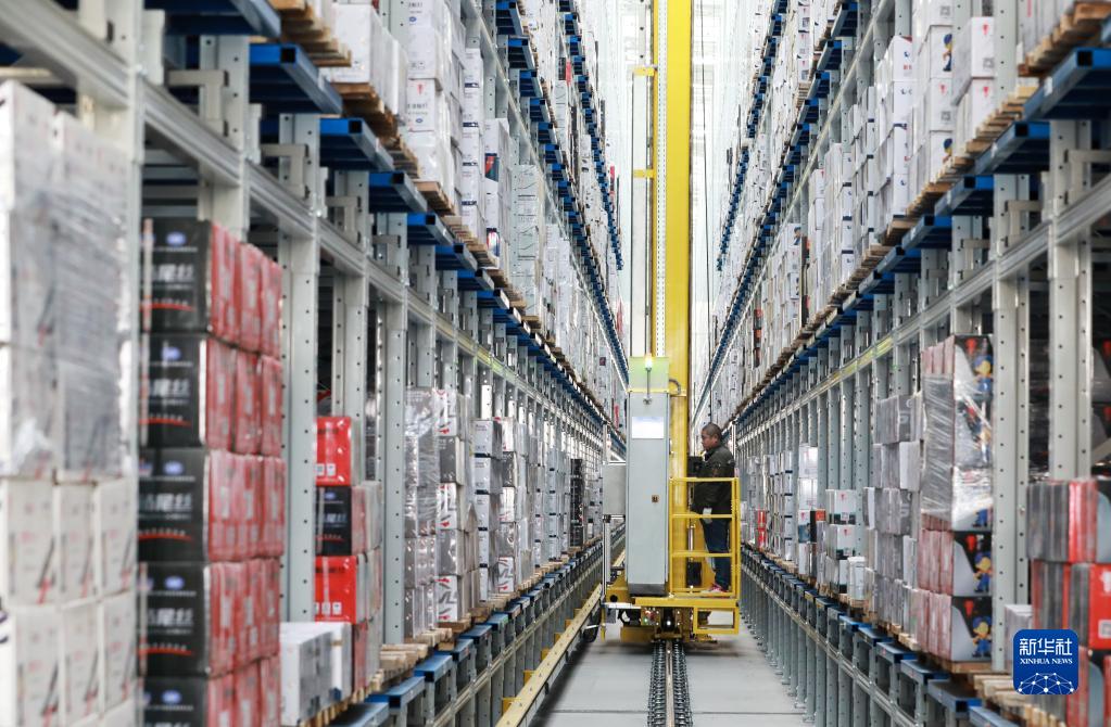 2月15日,在河北省邯鄲市永年區一緊固件生產(chǎn)企業(yè),工人在智能倉儲車(chē)間用設備裝卸貨物。
