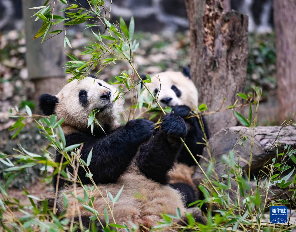2月15日,在中國大熊貓保護研究中心都江堰基地,大熊貓在吃竹子。