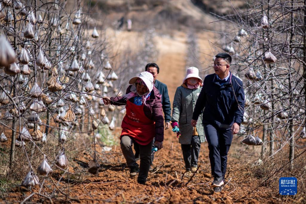 全國人大代表袁海波(右一)在云南省曲靖市馬龍區一種植基地與務(wù)工人員聊天(2月11日攝)。新華社記者 江文耀 攝