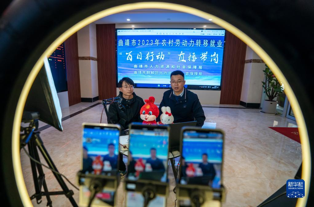全國人大代表袁海波(右)在云南省曲靖市麒麟區人力資源服務(wù)產(chǎn)業(yè)園通過(guò)網(wǎng)絡(luò )直播宣傳就業(yè)服務(wù)政策(2月11日攝)。新華社記者 江文耀 攝