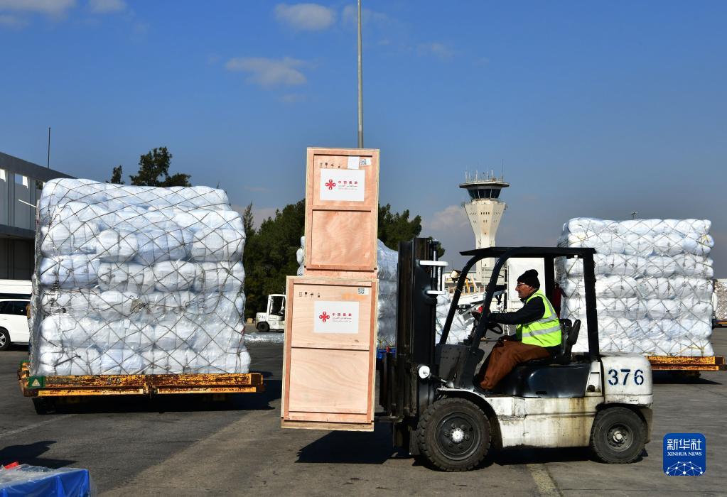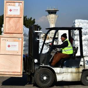 2月15日,工作人員在敘利亞大馬士革國際機場(chǎng)卸載中國政府援助的人道主義物資。