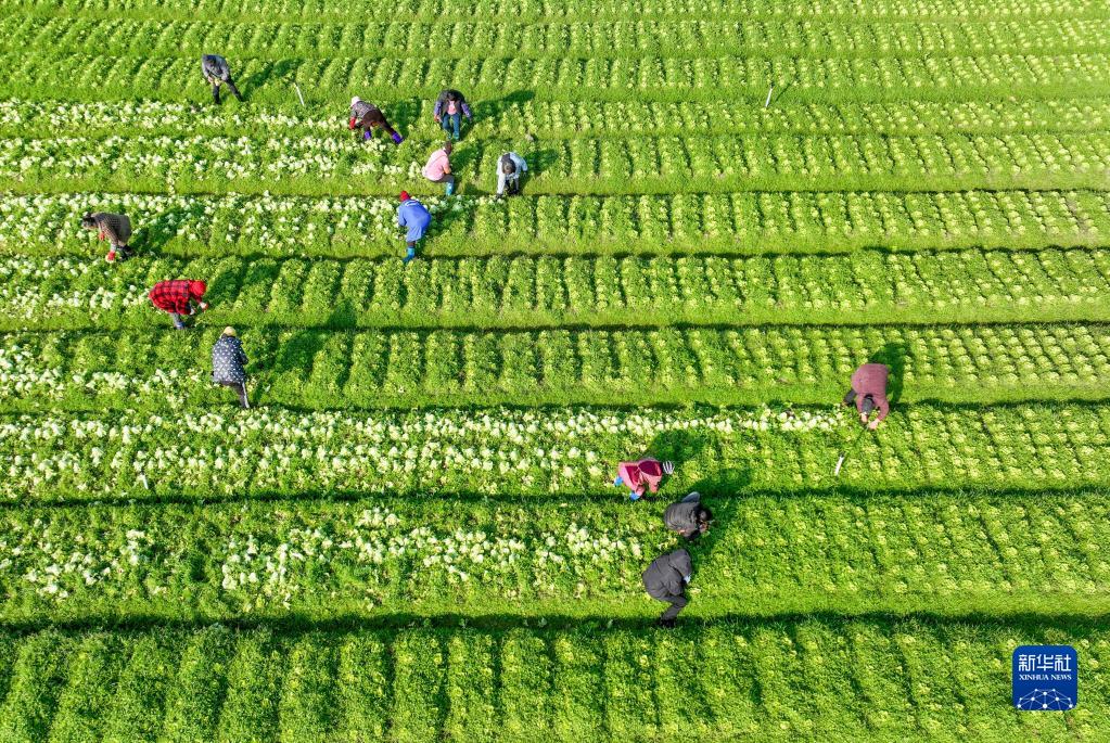2月15日,農民在湖南省永州市道縣正禾農場(chǎng)蔬菜基地采收蔬菜(無(wú)人機照片)。