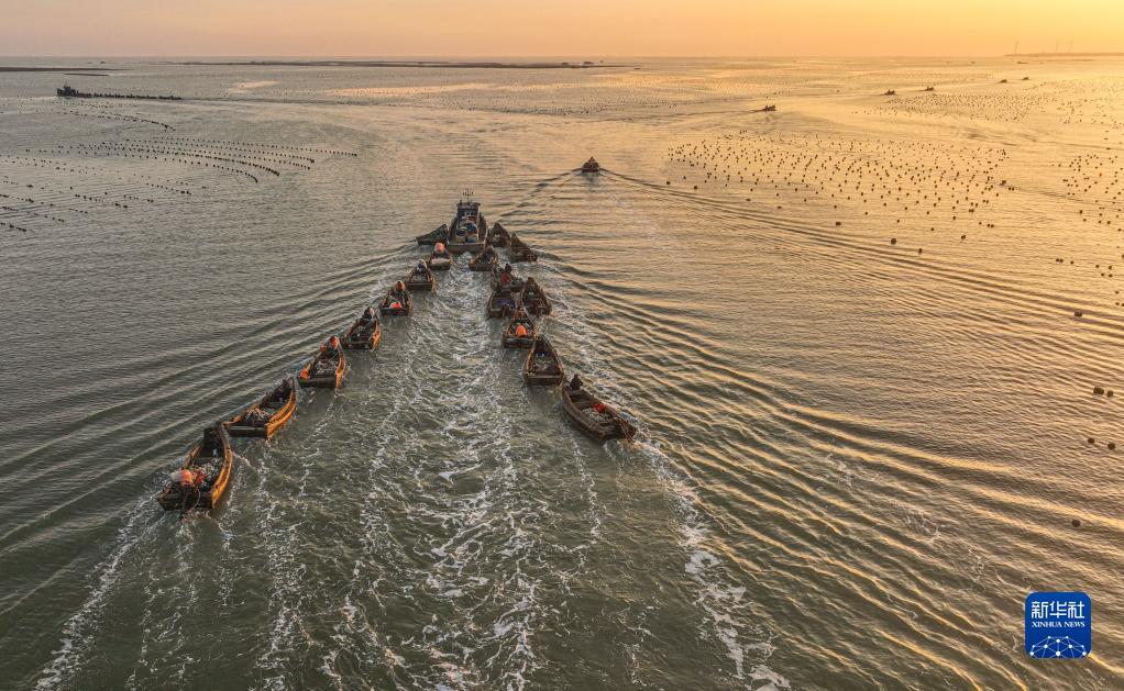 2月16日,在榮成市石島管理區桑溝灣海洋牧場(chǎng)網(wǎng)箱養殖區,漁民駕駛漁船出海作業(yè)(無(wú)人機照片)。