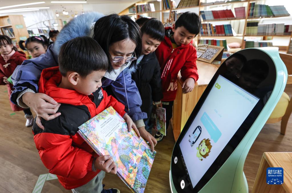 2月15日,在常州市新北區龍虎塘街道中心幼兒園(盤(pán)龍新區),老師在指導小朋友通過(guò)“人臉識別+語(yǔ)音互動(dòng)”的云上借閱系統借閱圖書(shū)。