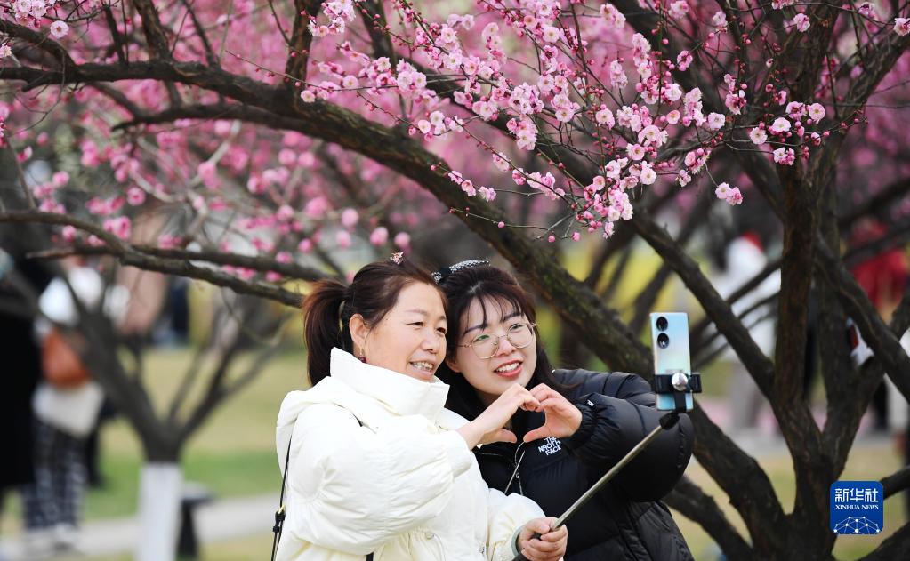 2月15日,安徽省合肥市蜀山區綠軸公園梅花盛開(kāi),市民前來(lái)拍照打卡留念,盡享春光。