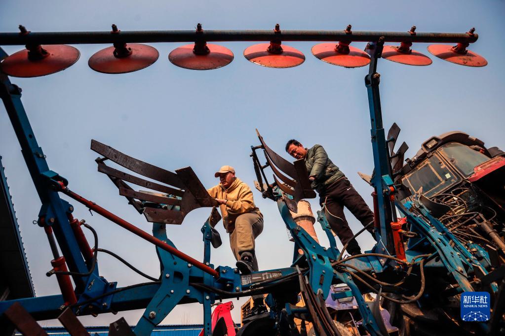2月16日,農民在遵化市西留村鎮的一家農機服務(wù)專(zhuān)業(yè)合作社檢修旋耕機。