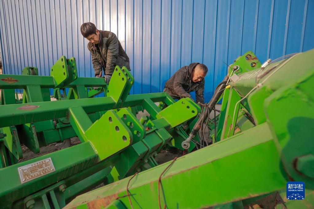 2月16日,農民在遵化市西留村鎮的一家農機服務(wù)專(zhuān)業(yè)合作社維護旋耕機。