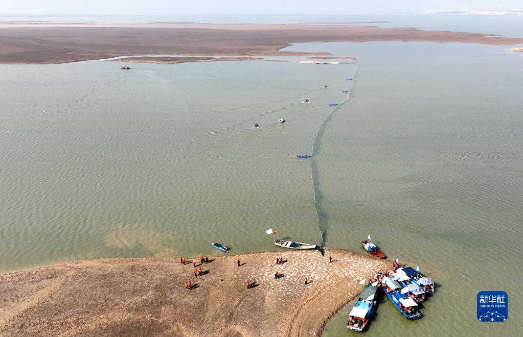 在江西鄱陽(yáng)湖松門(mén)山水域,工作人員用快艇和漁船合圍江豚(2月15日攝,無(wú)人機照片)。