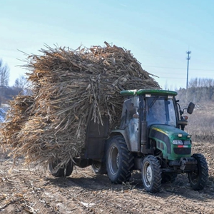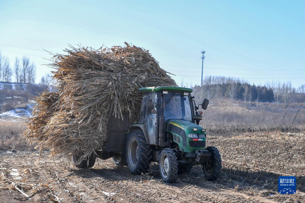 2月16日,在吉林省長(cháng)春市九臺區東湖街道腰站村,隆達興養殖農民專(zhuān)業(yè)合作社農民駕駛農機運輸玉米秸稈。