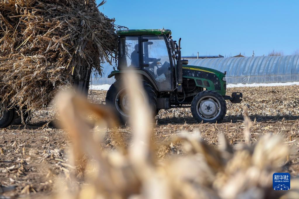 2月16日,在吉林省長(cháng)春市九臺區東湖街道腰站村,隆達興養殖農民專(zhuān)業(yè)合作社農民駕駛農機運輸玉米秸稈。