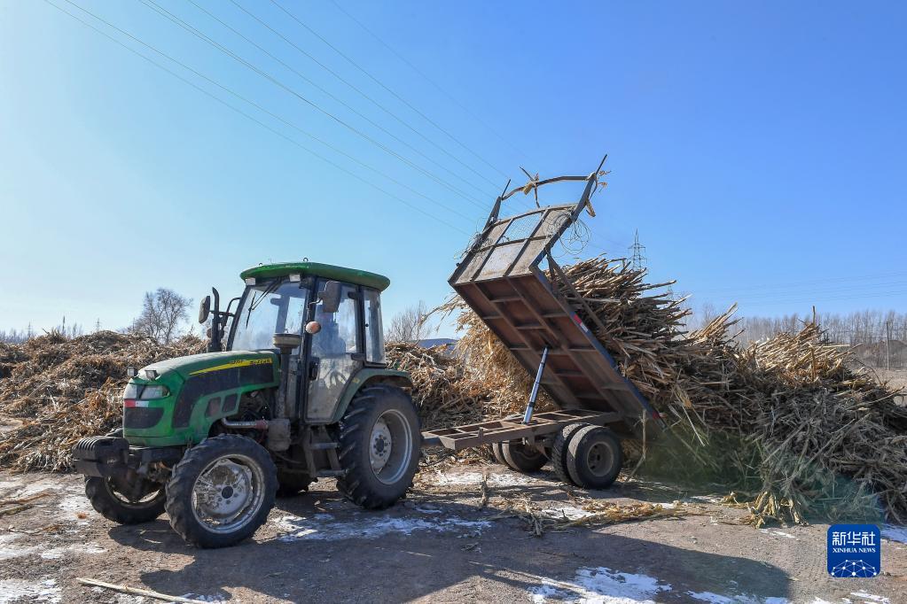 2月16日,在吉林省長(cháng)春市九臺區東湖街道腰站村,隆達興養殖農民專(zhuān)業(yè)合作社農民將玉米秸稈卸到場(chǎng)院。