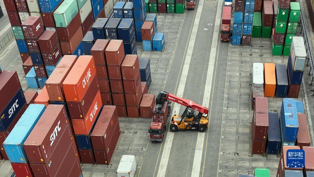 2月15日,工人在欽州港集裝箱碼頭駕駛裝卸車(chē)調運集裝箱(無(wú)人機照片)。