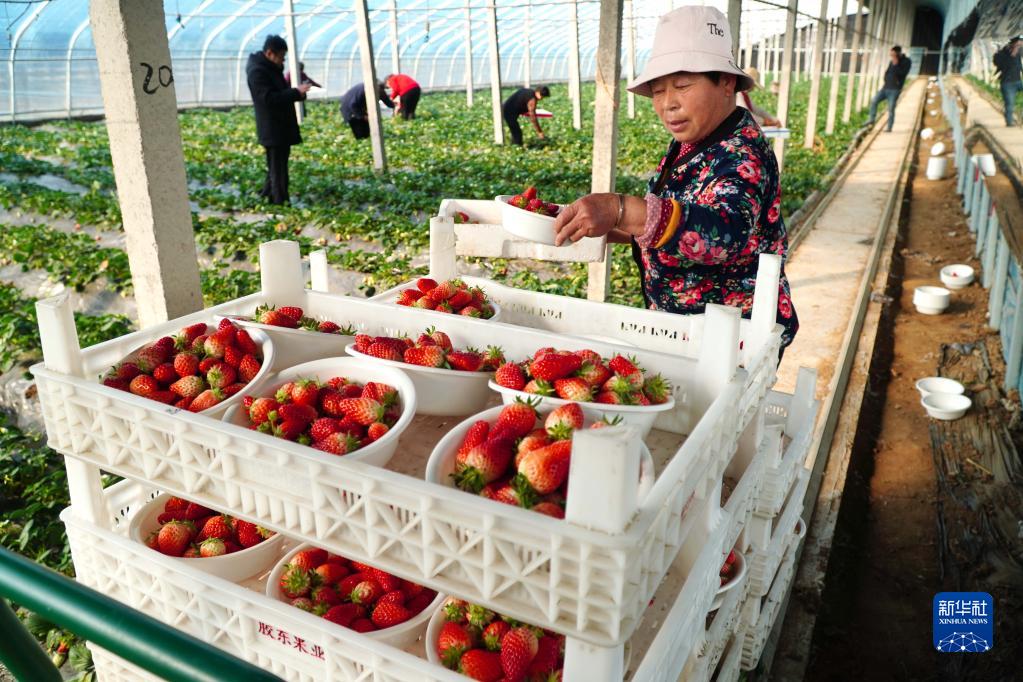 2月16日,在山東省東平縣無(wú)鹽村的草莓種植大棚,村民整理采摘的草莓。
