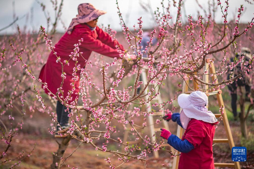 2月16日,在云南省文山市一處蜜桃基地,農民在疏花。