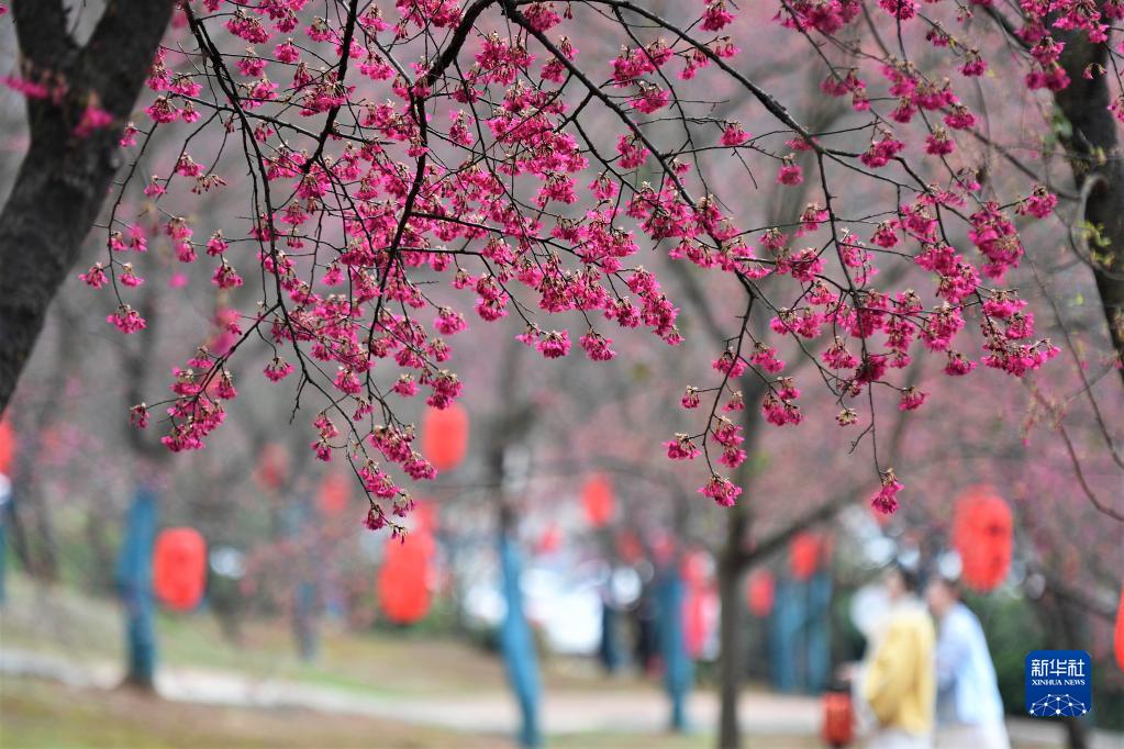 2月16日,游客在湖南省郴州市桂陽(yáng)縣櫻花園賞花。