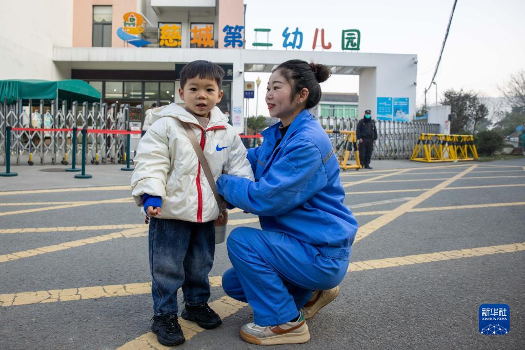 2月16日早晨,岑福珍在幼兒園門(mén)口為兒子羅亮整理衣服。