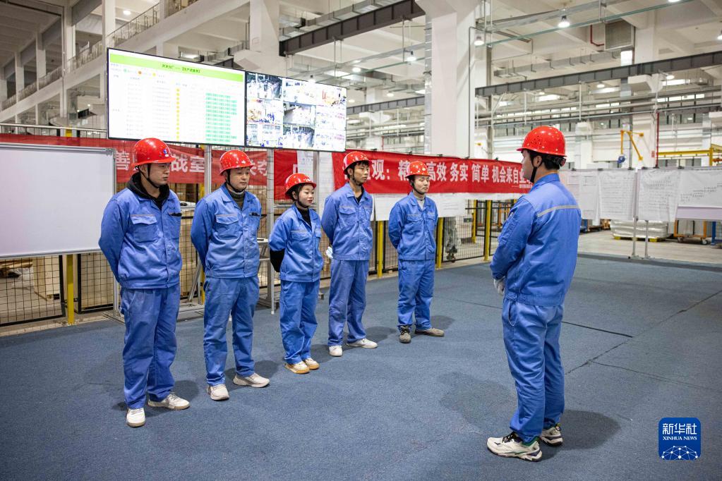 2月16日,岑福珍(左三)在工作開(kāi)始前參加班組生產(chǎn)會(huì )議。