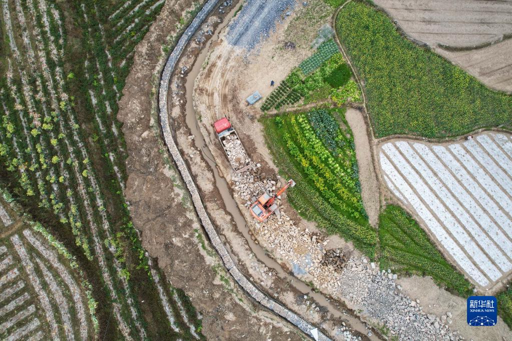 2月16日,工人在貴州省羅甸縣逢亭鎮腮里村治理河道,為春耕生產(chǎn)灌溉做準備(無(wú)人機照片)。