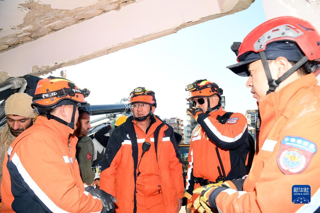 2月9日,中國救援隊隊員在土耳其哈塔伊省安塔基亞市開(kāi)展救援工作。