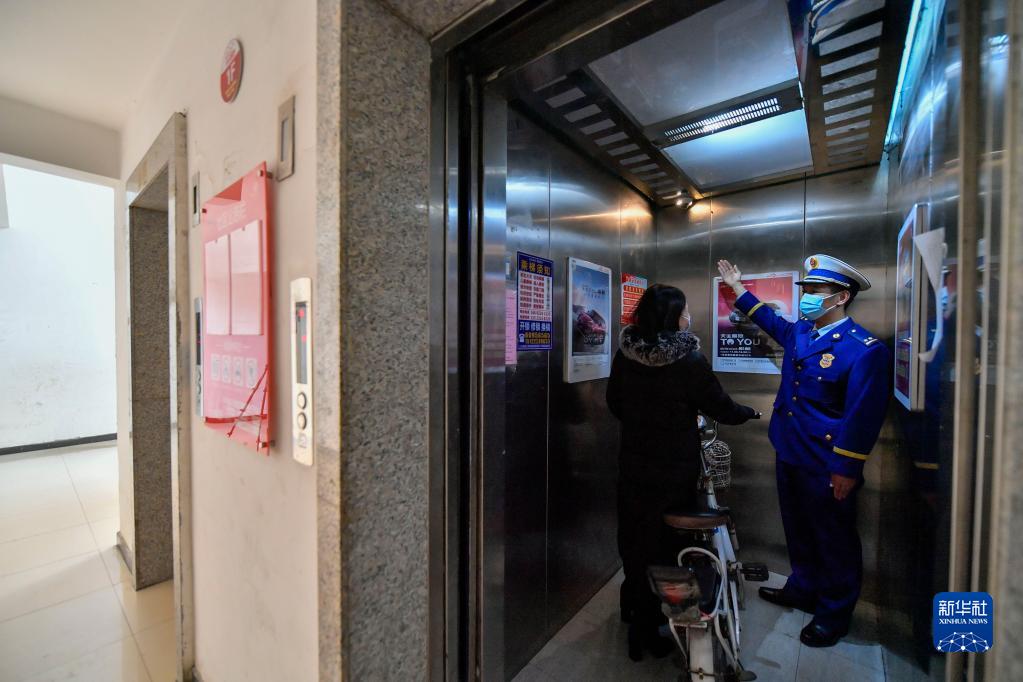 2月16日,天津市東麗區消防救援支隊工作人員在張貴莊街道華亭里社區躍麗家園小區為居民講解智能梯控系統。