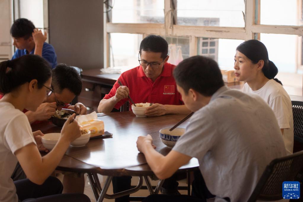 2月14日,在中非共和國首都班吉,第19批援中非中國醫療隊成員在駐地吃午飯。