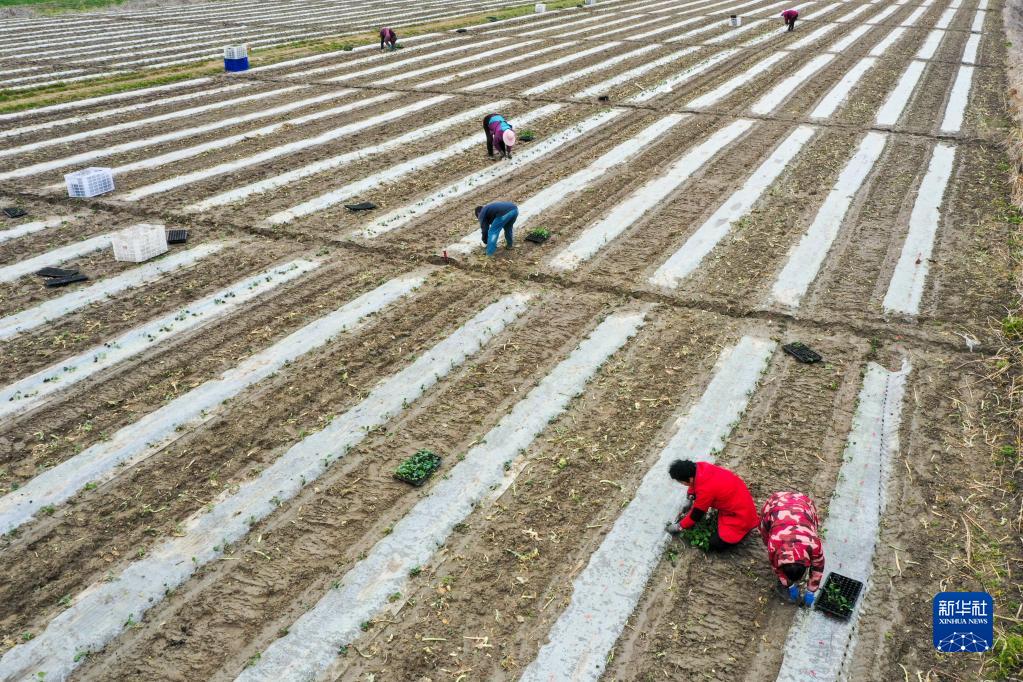 2月17日,農民在江蘇省南通市如東縣大豫鎮一處農田移栽西蘭花幼苗(無(wú)人機照片)。
