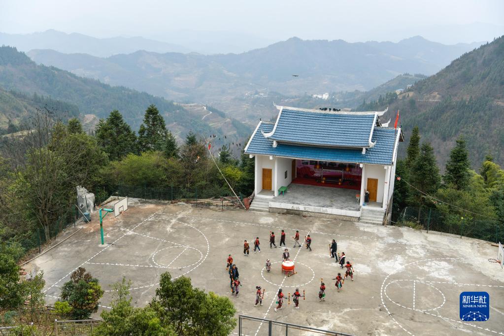 2月16日,貴州省從江縣西山鎮中寨教學(xué)點(diǎn)學(xué)生練習瑤族長(cháng)鼓舞。