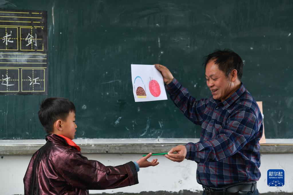 2月16日,貴州省從江縣西山鎮中寨教學(xué)點(diǎn)教師孟榮達(右)給美術(shù)手工課上表現好的學(xué)生發(fā)放畫(huà)筆獎品。