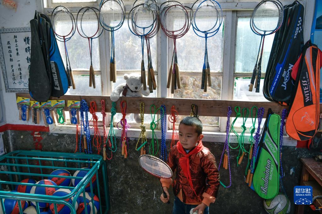 2月16日,貴州省從江縣西山鎮中寨教學(xué)點(diǎn)學(xué)生在體育器材角領(lǐng)取羽毛球拍,準備去上體育課。