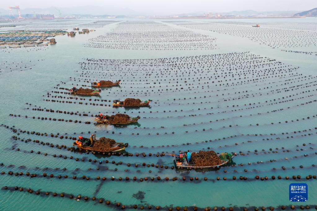 2月17日,在山東威海榮成市俚島灣養殖海區內,漁工在收獲牡蠣(無(wú)人機照片)。